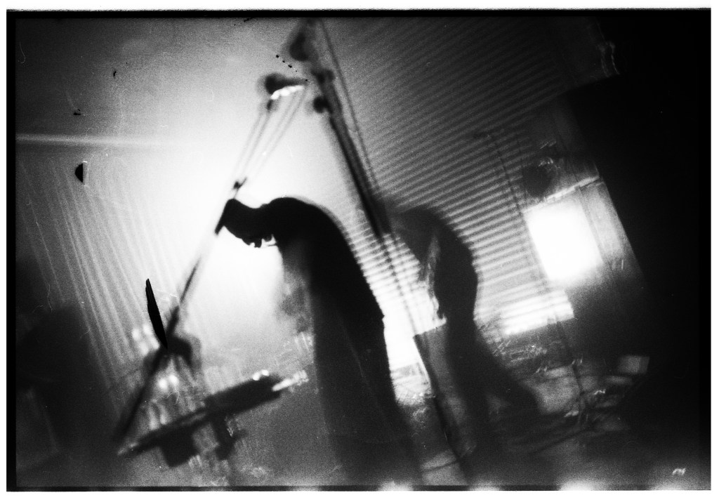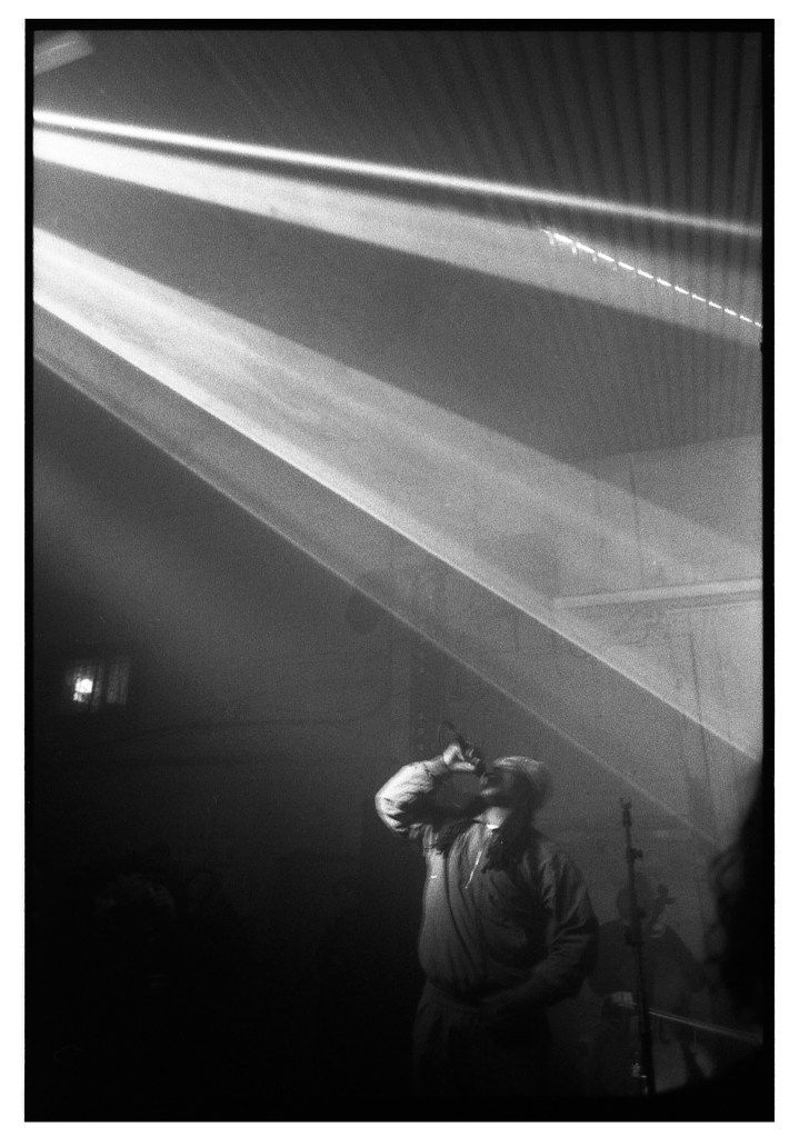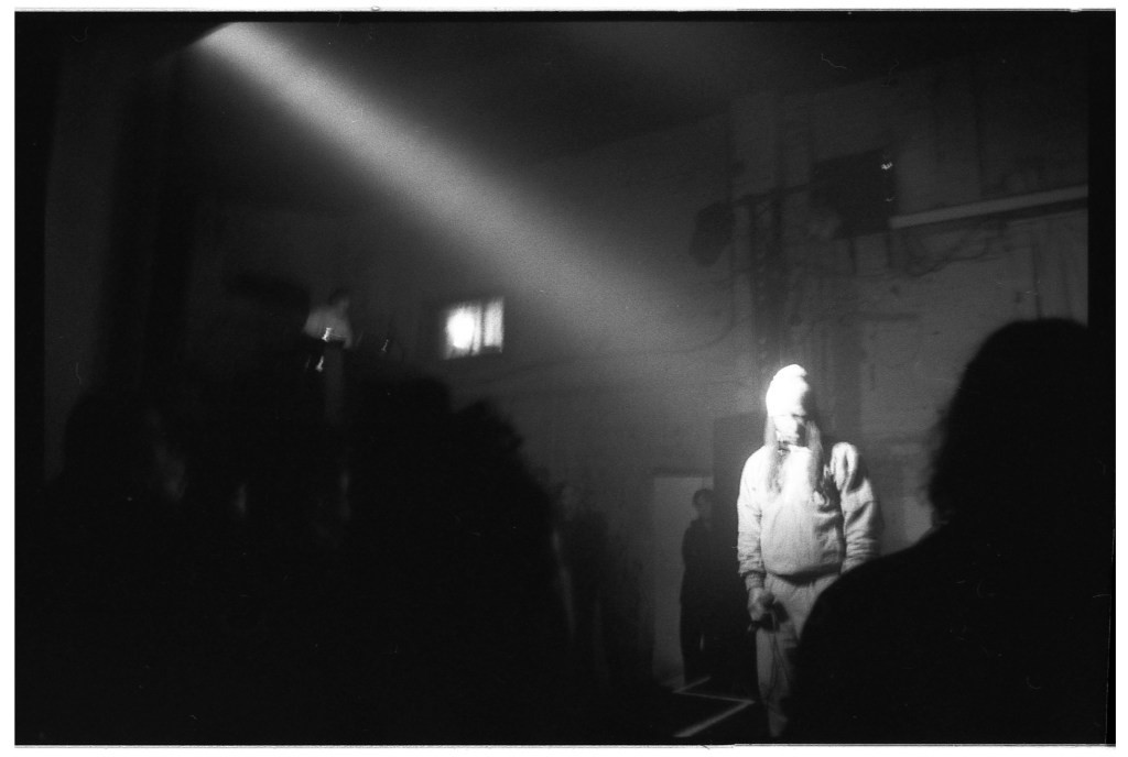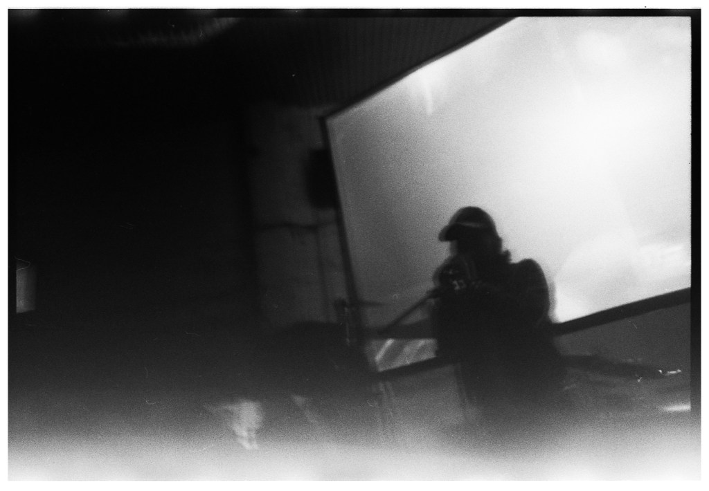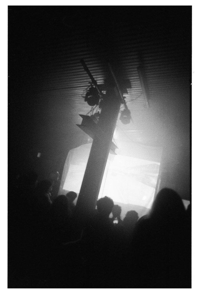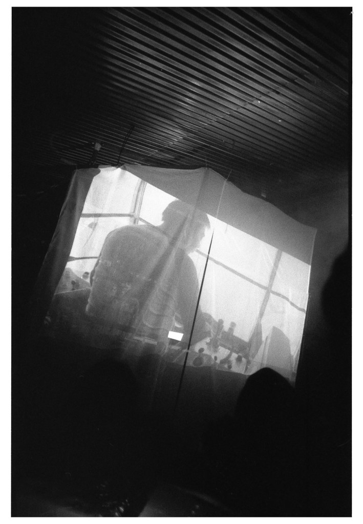 How do you translate a four-and-a-half hour audio offload of rainy day bus ride headphone music into the live setting? The answer is simple… Get a big sheet. Hang it down from the ceiling of an old car garage. Project video footage of container yards and Tottenham streets onto it. Stand behind it and speak slowly over the music.